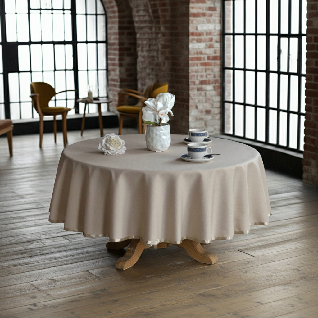 Wyjątkowy okrągły beżowy obrus plamoodporny to połączenie elegancji, praktyczności i ciepłego klimatu wnętrza. Wykonany z wysokiej jakości tkaniny o strukturze lnu w kolorze beżowym – przypominającym delikatne odcienie kawy z mlekiem lub cappuccino – stanowi doskonałą bazę dla codziennych i odświętnych aranżacji stołu.