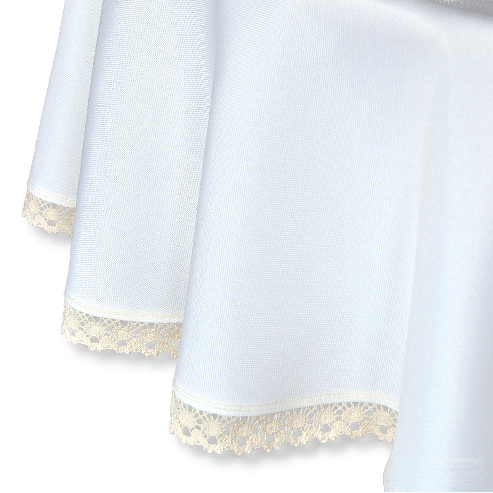 Obrus został uszyty z plamoodpornej tkaniny o ścisłym splocie i matowym połysku, ozdobiony bawełnianą koronką w kolorze ecru. Staranny sposób wszycia koronki sprawia, że obrus prezentuje się estetycznie z obu stron i pozwala zmieniać charakter stołu w zależności od okazji.