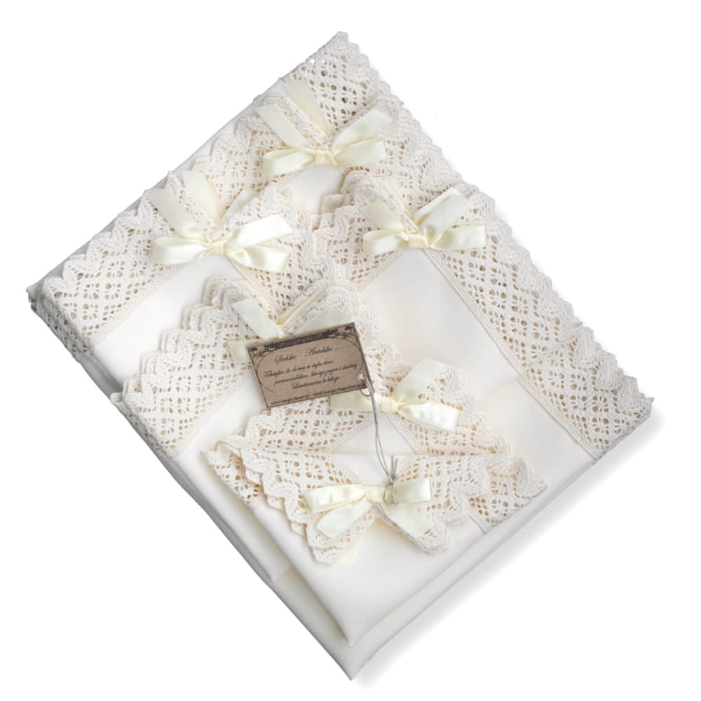 - Wykończenie z bawełnianej koronki i atłasowych kokardek – subtelne, ręczne detale dodające klasy.