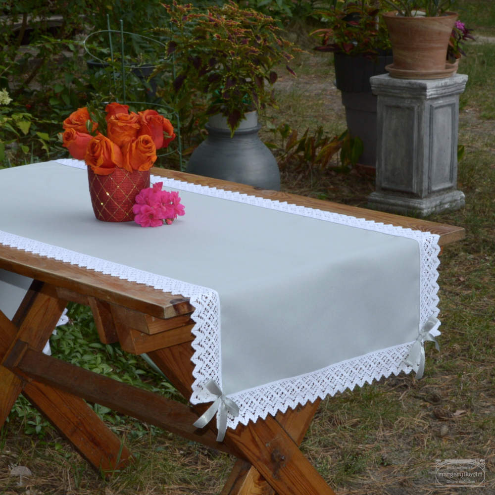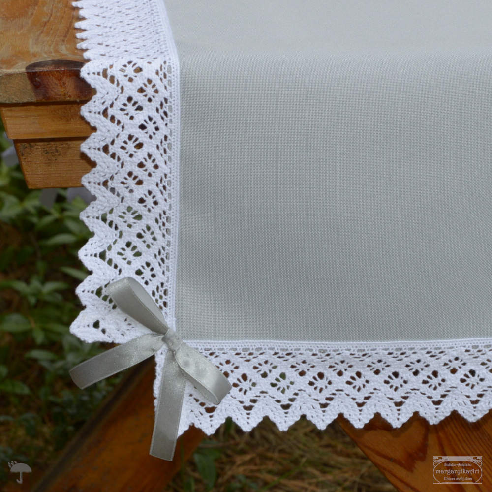 Szary bieżnik MargarytkaArt z białą, bawełnianą koronką i delikatnymi szarymi kokardkami w rogach to wyjątkowy dodatek, który odmieni wygląd stołu, ławy lub komody. Dzięki właściwościom plamoodpornym zachowa piękny wygląd na długo i sprawdzi się zarówno na co dzień, jak i podczas świątecznych spotkań.