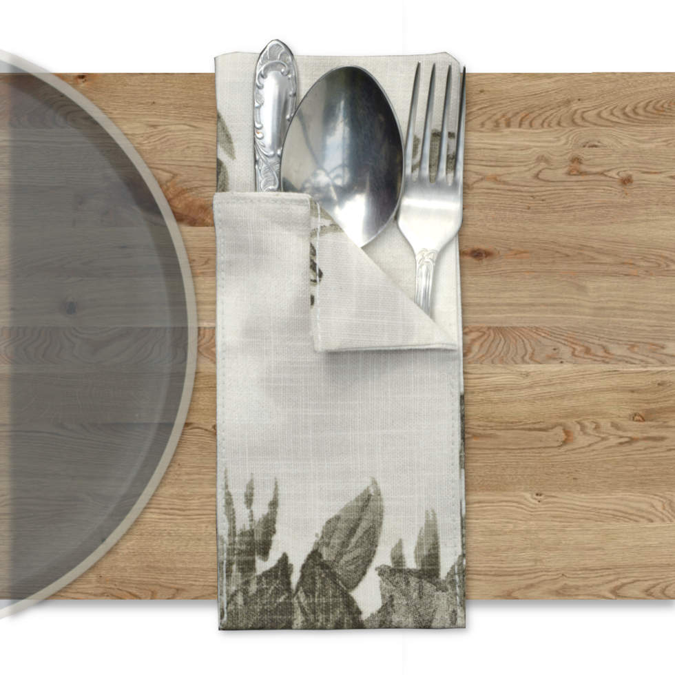 - Niepowtarzalny styl: Bawełniane etui na sztućce z kolekcji Liście dodają niepowtarzalnego charakteru każdemu nakryciu stołu przez zastosowanie roślinnego wzoru.