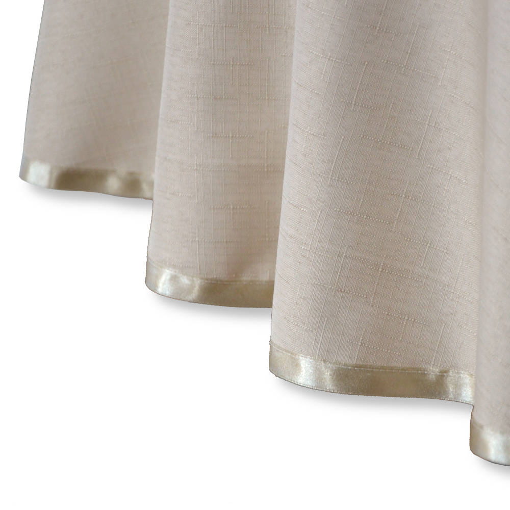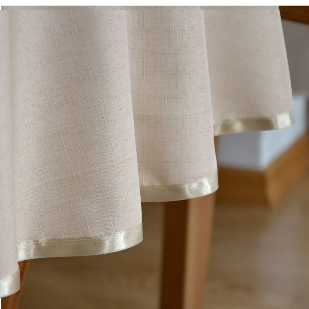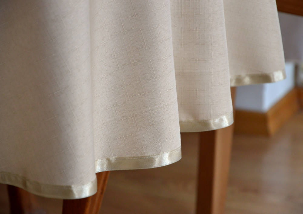 Obrus owalny na stół owalny w kolorze beżowym z deseniem lnu. Dół ozdobiony dekoracyjnym potrójnym ściegiem w ciemniejszym odcieniu.