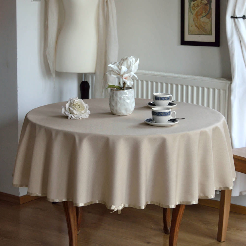Ten beżowy obrus owalny na stół to połączenie funkcjonalności i stylu. Uszyty z materiału o wysokiej