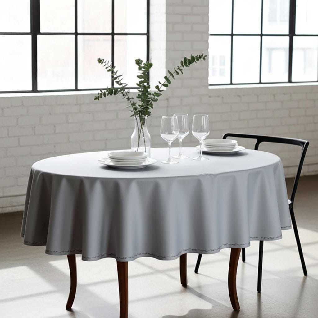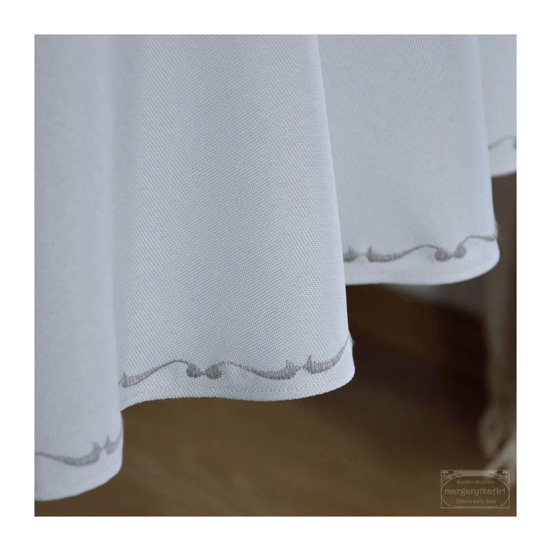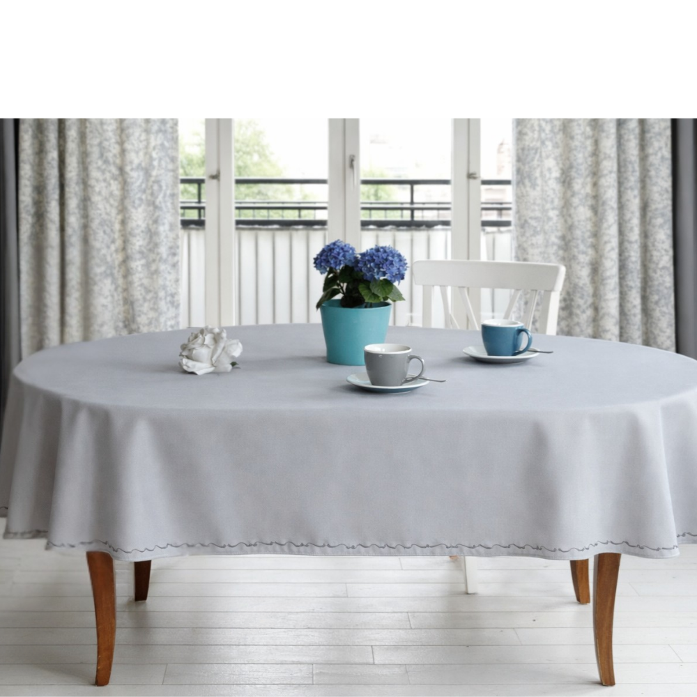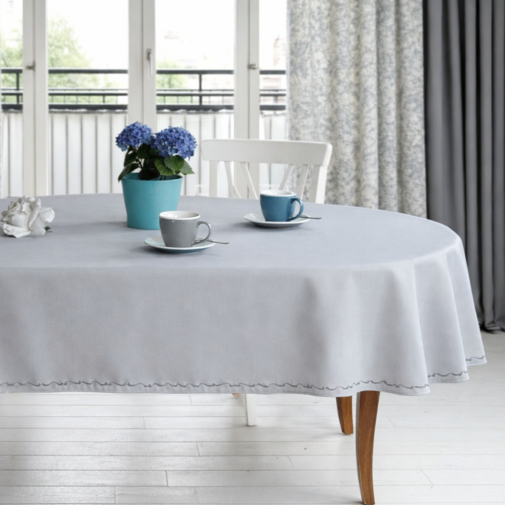 Obrus owalny plamoodporny w kolorze szarym. Dół ozdobiony eleganckim, subtelnym haftem w kolorze ciemno szarym.